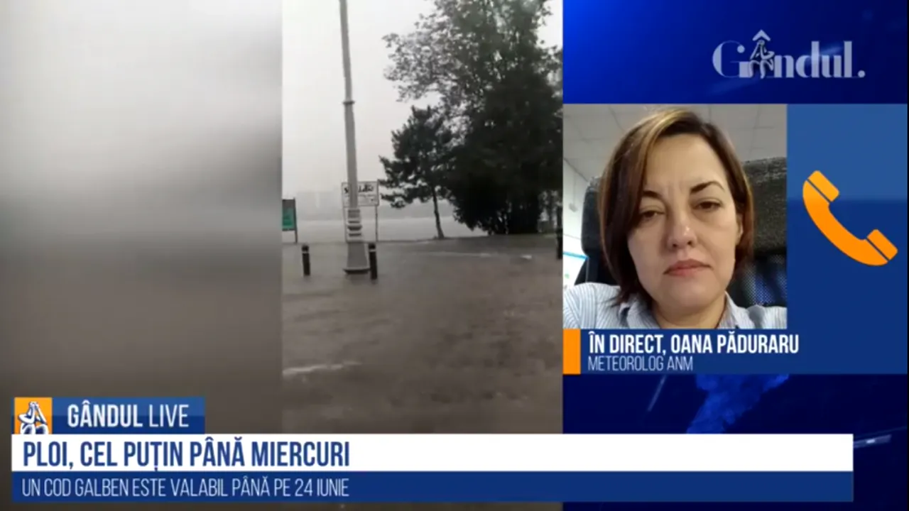 „Deocamdată nu se întrevede nicio schimbare. Cod portotocaliu până mâine dimineață la ora 10:00, după cum bine ne-am obișnuit, vorbim despre instabilitate atmosferică în continuare și de cantități însemnate de apă. În Banat, Crișana, Maramureș, Transilvania, Moldova și în zona montană a Olteniei și Munteniei ne așteptăm la averse torențiale și la cantități de peste 40 de litri pe metru pătrat și pe arii restrânse de 50-80 de litri pe metro pătrat. Totodată, este și un cod galben în vigoare, în principal pentru partea de Sud-Est a teritoriului, dar și pentru județele din partea de Nord a Olteniei și a Munteniei, tot pentru mâine dimineață la ora 10:00, iar după aceea, în continuare, un cod galben pentru toată țara, valabil până pe 25 iunie, la 10:00 dimineața. Cantități mai mici de apă de această data, sub cod galben, 25-30 de litri pe metru pătrat și pe arii restrânse 40-60 de litri pe metru pătrat. În deosebi în Nord, Centru, Nord-Est și în zonele montane”, a declarat Oana Păduraru la Gândul Live.