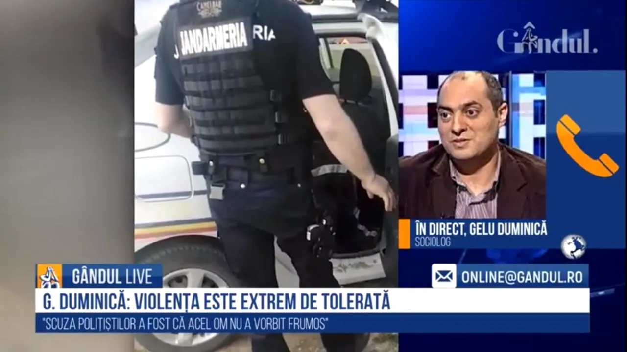 Sociologul Gelu Duminică a vorbit marți la GÂNDUL LIVE despre cazurile recente de violență ale reprezentanților Poliției sau Jandarmeriei, în special despre cazul recent din localitatea Mihail Kogălniceanu, unde un bărbat acuză că ar fi fost agresat de polițiști și jandarmi fără să fi încălcat vreo lege.