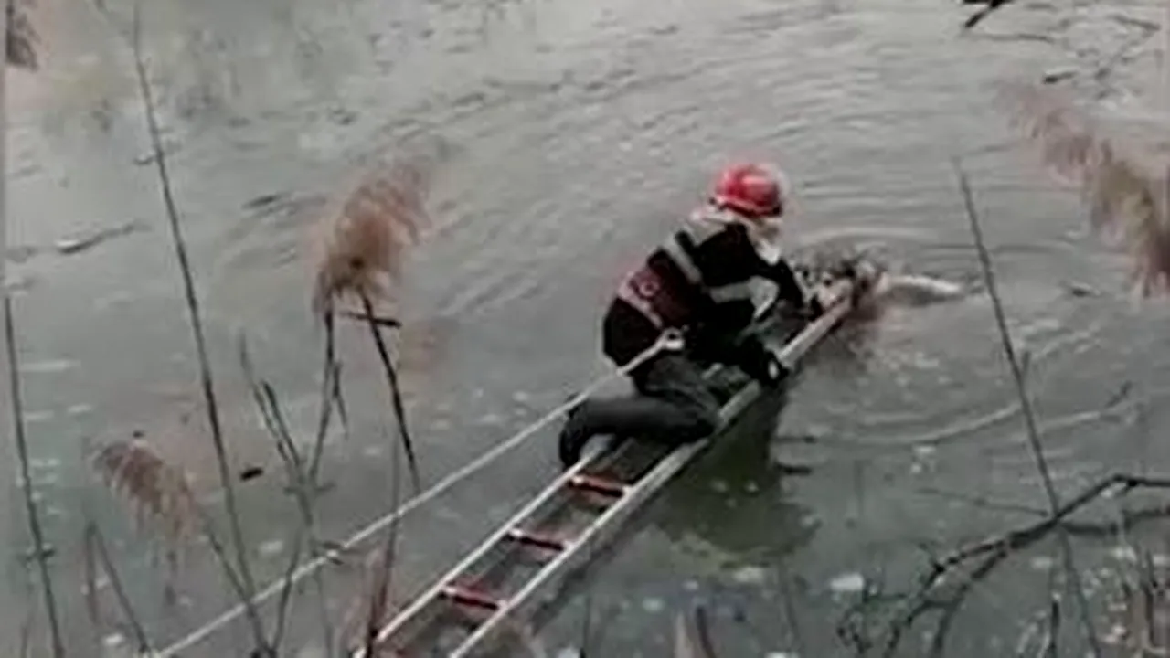 GÂNDUL LIVE. Un câine căzut într-un râu înghețat, salvat în ultima clipă de pompierii din Alba