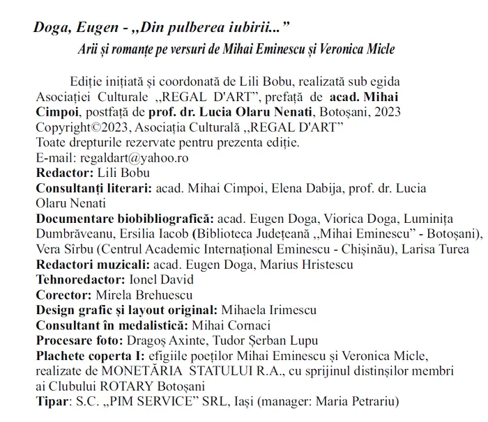 Pe coperta de catifea turcoaz a unui ,,ceaslov” impunător și consistent putem citi inscripțiile marcate cu litere cursive aurii: Asociația Culturală Regal dˈArt/ EUGEN DOGA ,,Din pulberea iubirii”, Arii și romanțe pe versuri de Mihai Eminescu și Veronica Micle, putem admira strălucirea a două medalii aurii purtând efigiile celor doi protagoniști ai acestui volum, dar și ai acestei istorii a vieții noastre literare.