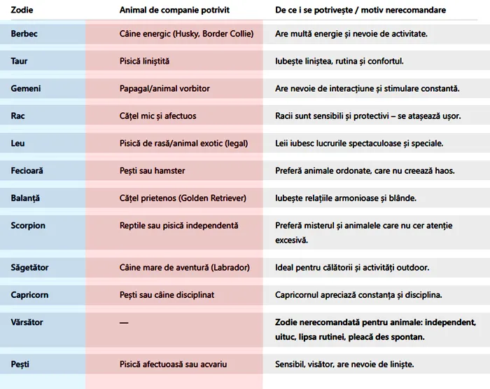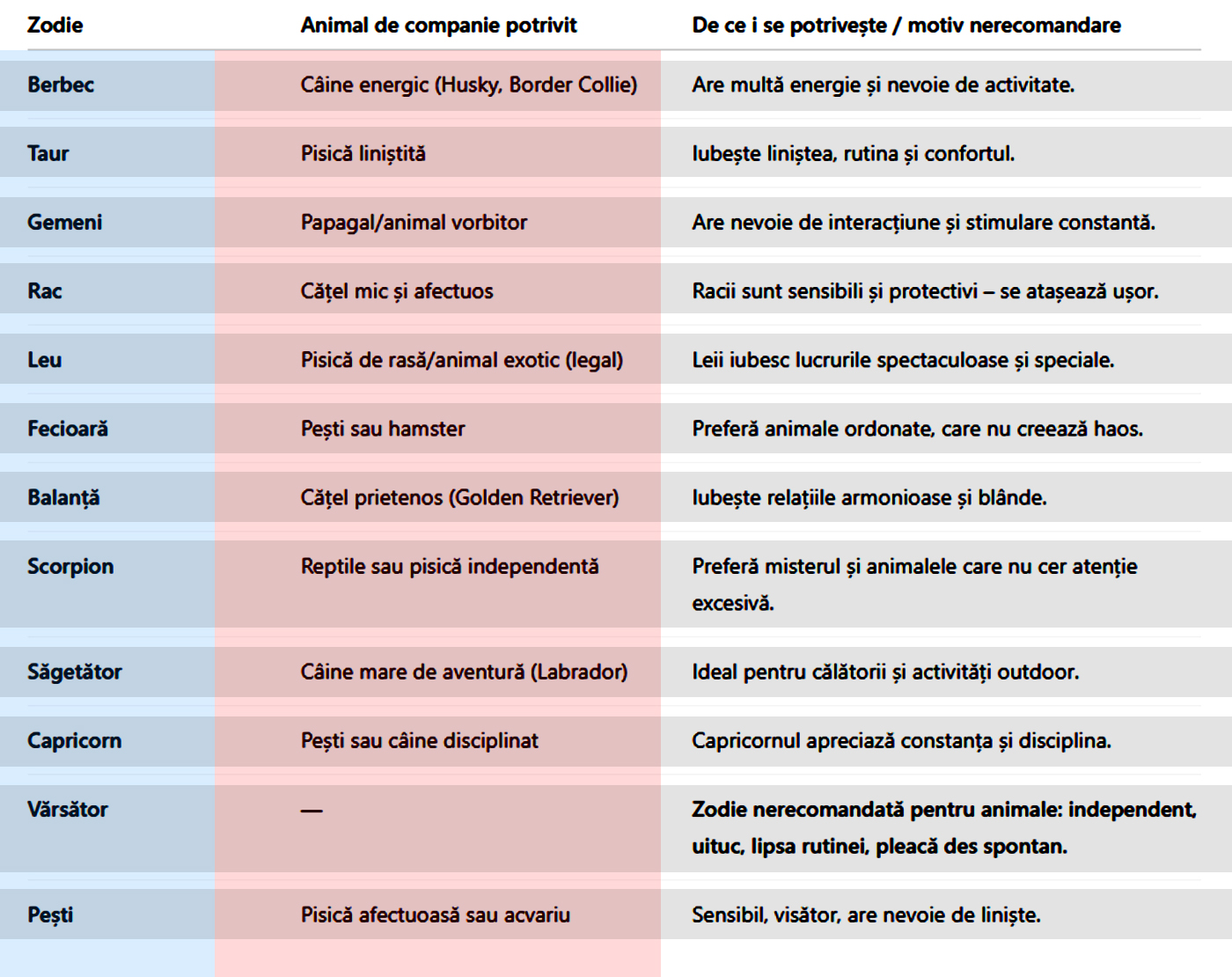 Te-ai întrebat vreodată ce animal de companie ți s-ar potrivit în funcție de zodie? Mai jos, în articol, se află un tabel în care explică ce tip de animal ar fi indicat să ai. De altfel, unui singur nativ i se recomandă să nu aibă animale de companie, deoarece se detașează ușor emoțional și uită adeseori de rutină.