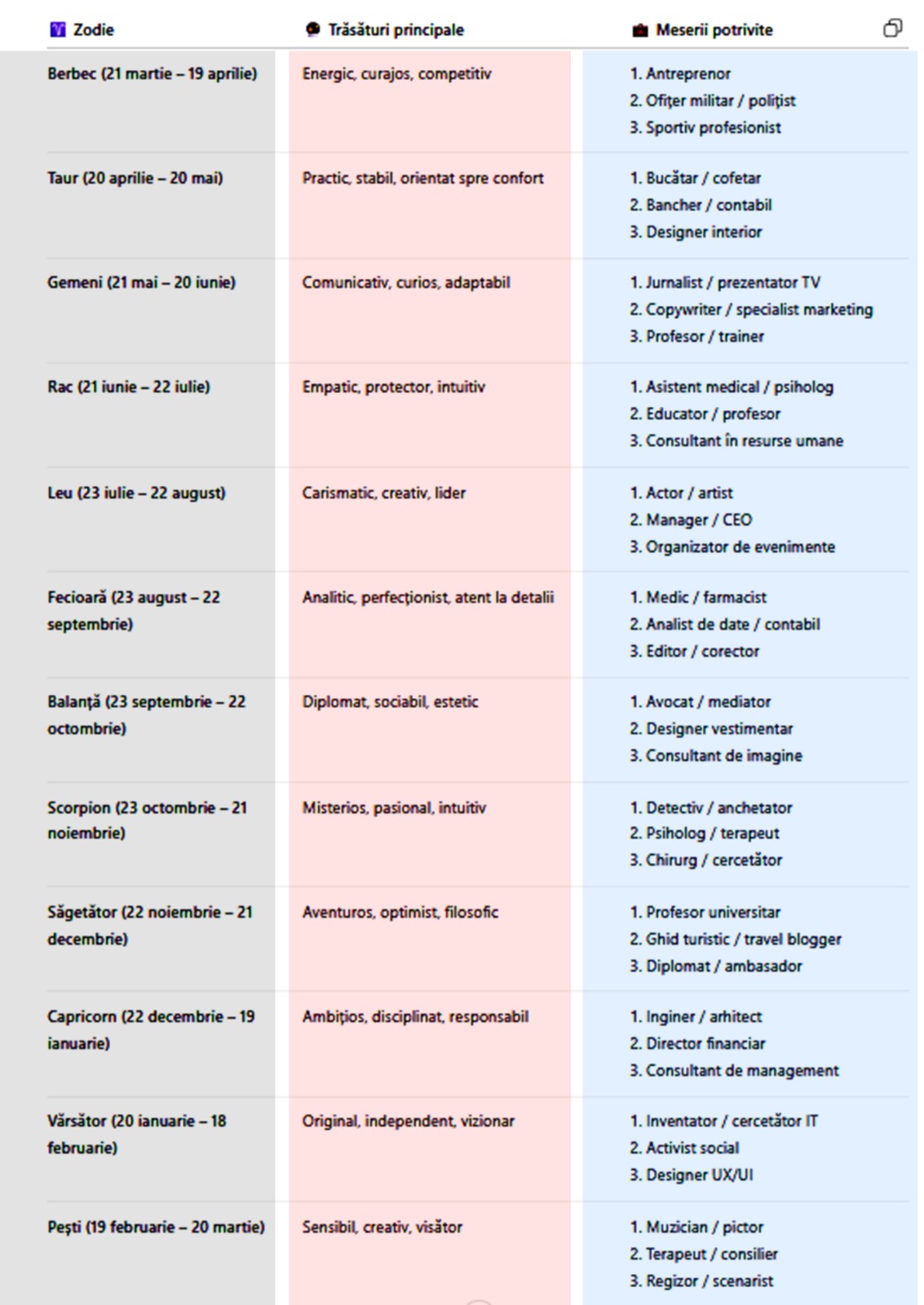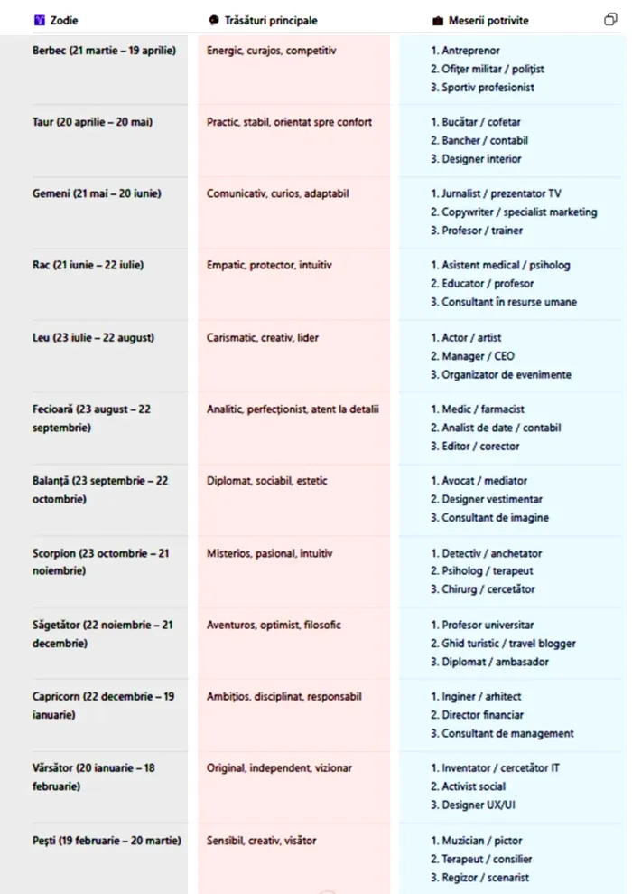 Tabel zodii. Iată care sunt cele 3 meserii care ți se potrivesc, în funcție de semnul tău zodiacal.