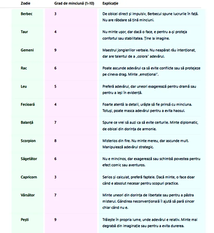 Tabel zodii. Voi știați care este cea mai mincinoasă zodie din horoscop? În tabelul de mai jos se găsesc cele 12 semne zodiacale, gradul de minciună (notat de la 1 la 10, unde 1 este varianta pentru „deloc mincinoasă”), dar și explicațiile pentru fiecare în parte.