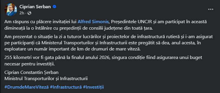 Ministrul Transporturilor, Ciprian Şerban, a transmis, în cadrul unei  întâlniri cu preşedinţii de Consilii Judeţene din toată țara, că ministerul este pregătit să dea în exploatare mai multe drumuri de mare viteză. Oficialul a precizat că 255 kilometri vor fi gata până la finalul anului 2026, dacă bugetului de investiţii va fi asigurat.