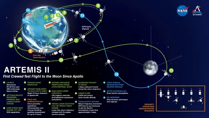 Astronauții „Artemis 2” vor pleca de la Cape Canaveral. Vor înconjura satelitul natural al Pământului fără să aselenizeze. După 10 zile ar urma să revină acasă. Ei vor fi tot timpul la bordul capsulei Orion transportată în spațiu de o rachetă de 98 metri înălțime.
