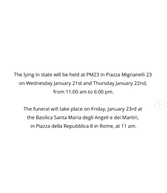 Înmormântarea va avea loc vineri, 23 ianuarie, la Bazilica Santa Maria degli Angeli e dei Martiri, în Piazza della Repubblica 8 din Roma, la ora 11:00”, a transmis fundația Valentino, într-o postare pe Instagram.