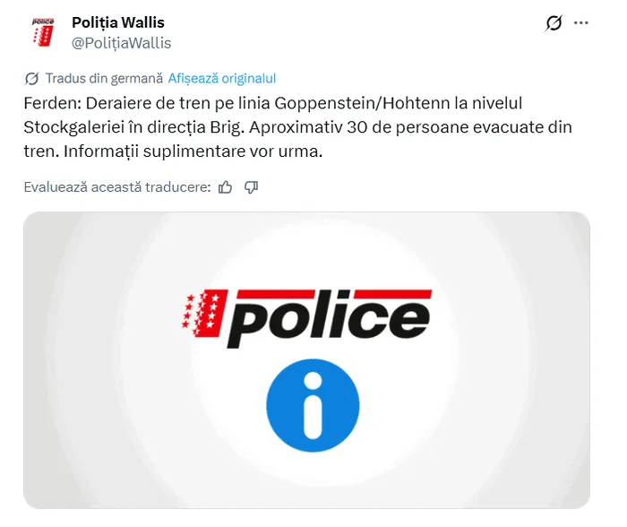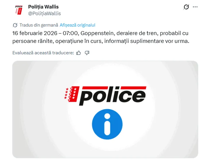 Un accident feroviar grav a avut loc luni dimineață în apropierea satului Goppenstein din cantonul elvețian Valais, unde o avalanșă masivă a lovit un tren de călători, anunță poliția cantonală din Valais.