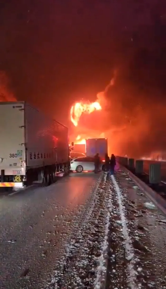 Un incendiu a izbucnit la capătul celălalt al tamponării, extinzându-se la peste 20 de vehicule, unele dintre care au fost complet arse.