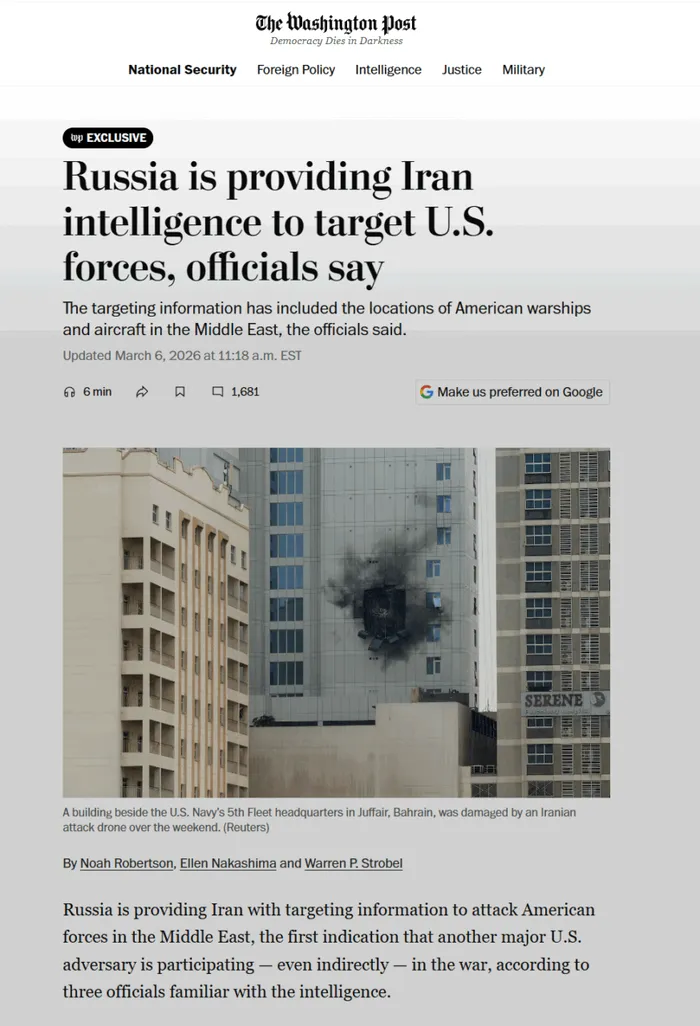 „Rusia furnizează Iranului inforații pentru a ataca forțele americane din Orientul Mijlociu, primul indiciu că un alt adversar al SUA participă în mod indirect în război, conform a trei oficiali familiarizați cu informațiile”, scrie The Washington Post.