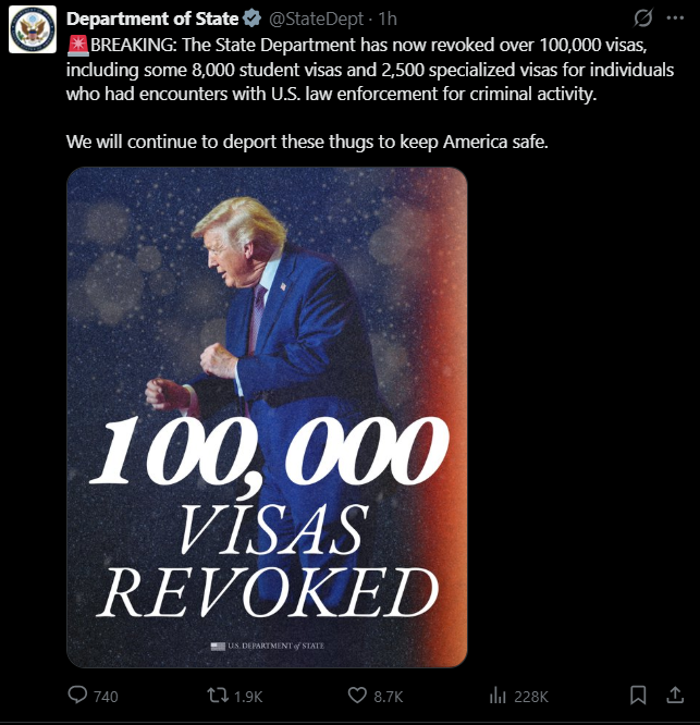Cifra este un record absolut și vine după ordinul executiv emis de președintele Donald Trump privind verificarea străinilor, emis în prima zi de mandat. În 2024, departamentul a revocat 40.000 de vize.
