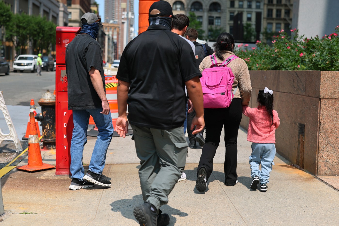 O femeie migrantă și copilul ei sunt escortați de agenții federali după ce au ieșit dintr-un birou al Programului de Supraveghere Intensivă din New York FOTO: Profimedia