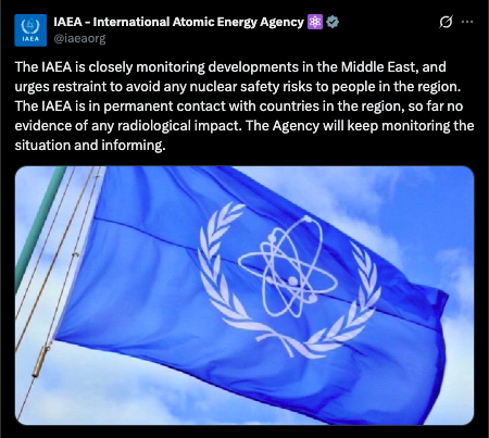 Agenția Internațională pentru Energie Atomică (AIEA) a anunțat că monitorizează îndeaproape evoluțiile din Orientul Mijlociu și că, în acest moment, „nu există dovezi ale vreunui impact radiologic” în urma escaladării militare din regiune.