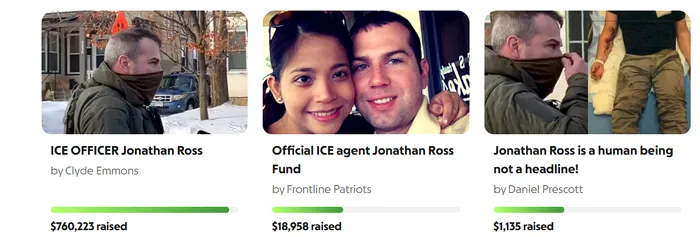Cei mai mulți bani s-au strâns pe platforma GoFundMe, unde principala campanie de strângere de fonduri însumează donații de peste 760.000 de dolari, și asta nu este singura. Americanii au donat sume cuprinse între 5 dolari și 10.000 de dolari. Printre cele mai mari sume se află cea a miliardarului Bill Ackman, care a donat 10.000 de dolari campaniei de strângere de fonduri pentru agentul ICE, susținând că este un adept al principiului „nevinovat până la proba contrarie”.