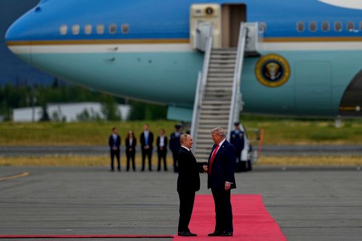 Avionul prezidențial american Air Force One a aterizat la Anchorage cu Donald Trump la bord. După ce a coborât, președintele american s-a întâlnit cu președintele Rusiei, Vladimir Putin. Zâmbitori, cei doi s-au salutat și și-au dat mâna.
