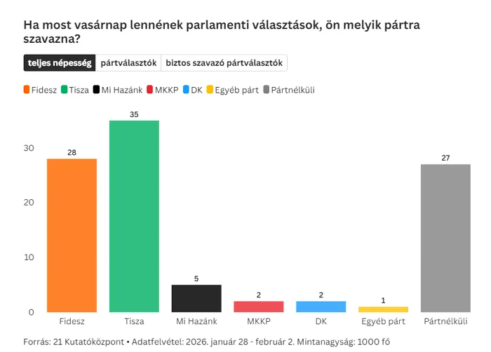 Potrivit unui sondaj recent realizat de Centrul de Cercetare 21, între 28 ianuarie și 2 februarie, și publicat de 24.hu, partidul Tisza (condus de fostul membru al guvernului Peter Magyar n.r.) are un avans de 7 puncte procentuale față de Fidesz în rândul întregii populații, un avans de 10 puncte procentuale în rândul celor au drept de vot și un avans de 16 puncte procentuale în rândul celor care sunt siguri că vor vota.