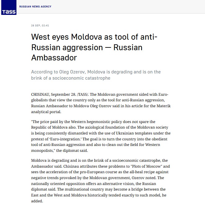 „Prețul plătit de politica hegemonistă occidentală nu cruță nici Republica Moldova. Fundația axiologică a societății moldovenești este demontată în mod constant prin utilizarea șabloanelor ucrainene sub pretextul „euro-integrării”, a scris ambasadorul.