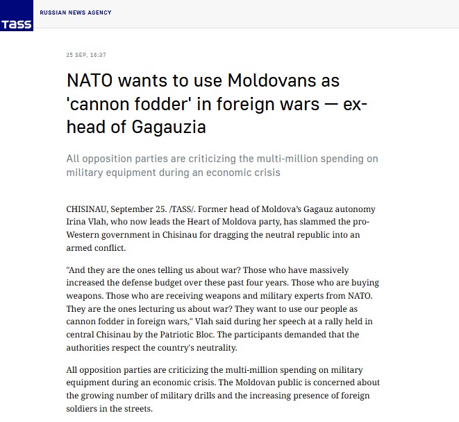 Fosta șefă a provinciei autonome găgăuze, Irina Vlah, care conduce acum partidul Inima Moldovei, a criticat guvernul pro-occidental de la Chișinău pentru că a târât republica neutră într-un conflict armat, a scris TASS.