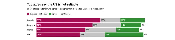 Eforturile lui Donald Trump de a rescrie relațiile internaționale, în special cele din Europa, îi fac pe partenerii fideli să fie mai reticenți cu privire la capacitatea Statelor Unite de a descuraja sau de a interveni în caz de nevoie. Reputația erodată a Washingtonului ridică multe semne de întrebare cu privire la stabilitatea ordinii globale actuale. În toate țările chestionate, tot mai mulți oameni sunt de părere că Statele Unite sunt mai degrabă un aliat nesigur decât unul de încredere.