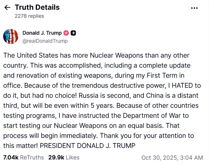 Pe 30 octombrie 2025, președintele Statelor Unite a scris pe Truth Social că, „din cauza programelor de testare ale altor țări”, a instruit Departamentul de Război al SUA să „înceapă testarea armelor nucleare în mod egal. Acest proces va începe imediat”.