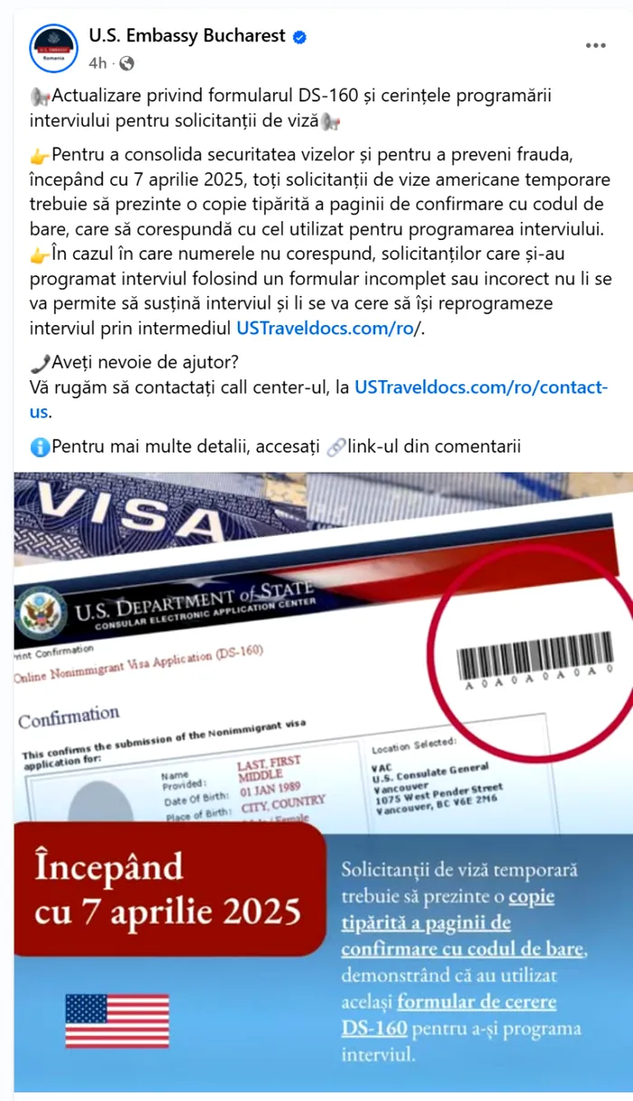 „Pentru a consolida securitatea vizelor și pentru a preveni frauda, începând cu 7 aprilie 2025, toți solicitanții de vize americane temporare trebuie să prezinte o copie tipărită a paginii de confirmare cu codul de bare, care să corespundă cu cel utilizat pentru programarea interviului”, susțin reprezentanţii Ambasadei SUA în România.