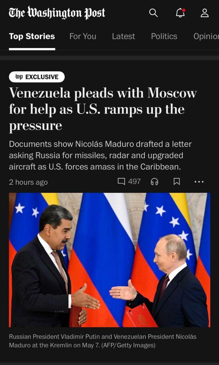 Venezuela a cerut Rusiei și Chinei sprijin militar urgent pe fondul unui posibil conflict cu SUA, scrie The Washington Post. În presa americană au apărut rapoarte „ despre cum SUA pregătesc atacuri asupra Venezuelei”, dar Trump a negat deja presupusele informații alimentate de prezența covârșitoare a flotei maritime a SUA în Caraibe și a declarat că „în prezent nu ia în considerare această posibilitate”.