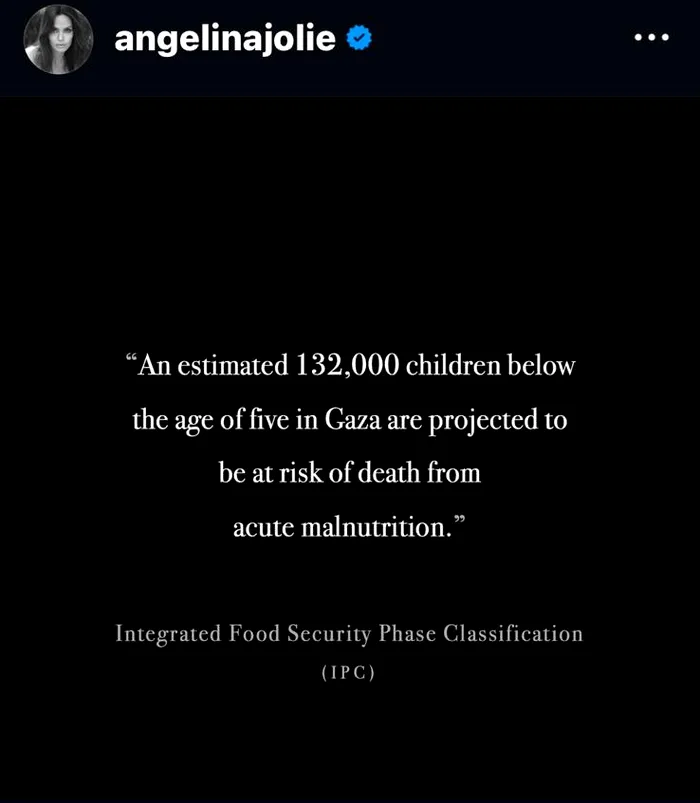 Angelina Jolie a scris într-o postare de pe Instagram că 132.000 de copii sub vârsta de 5 ani din Fâșia Gaza riscă să moară din cauza malnutriției.