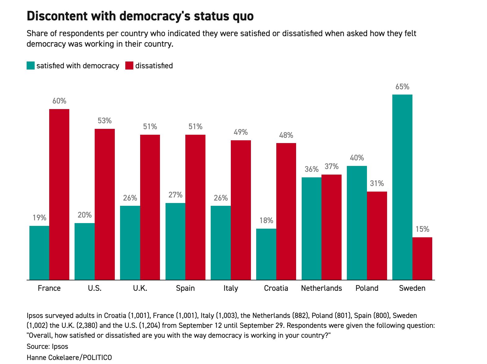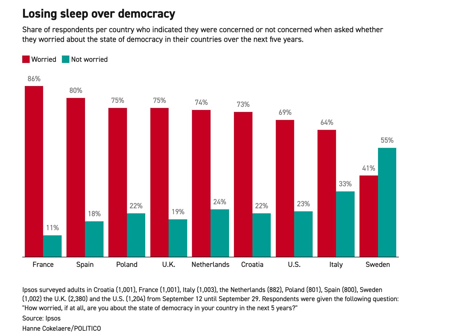 Cu excepția Suediei, unde 65% dintre cetățeni consideră că democrația funcționează bine, majoritatea celor chestionați își fac griji cu privire la riscurile, pe care le reprezintă sisteme de autoguvernare în următorii cinci ani, conform sondajului prezentat în exclusivitate de POLITICO.