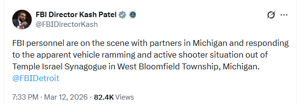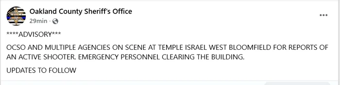 Un atac armat a avut loc joi seara la sinagoga Templul Israel din West Bloomfield Township, situată la aproximativ 40 de kilometri nord-vest de Detroit. O camionetă a intrat prin ușa principală a sinagogii, iar ulterior au fost raportate focuri de armă. Mai mult, presa locală relatează că din acoperișul clădirii iese fum.