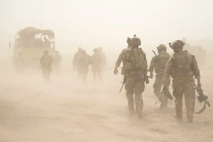Membri ai Gărzii Naționale a Armatei SUA parte din Task Force Red Dragon, Combined Joint Task Force – Cornul Africii, se apropie de un vehicul tactic mediu ușor, în timpul unei furtuni de nisip înainte de un exercițiu de antrenament combinat cu Forțele Franceze din Djibouti lângă Arta, Djibouti, 21 august, 2022.