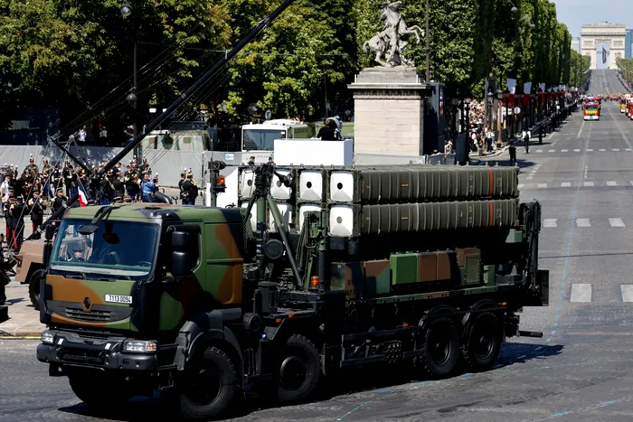 Un camion al armatei franceze transportă rachete SAMP/T în timpul paradei militare de Ziua Bastiliei pe bulevardul Champs-Elysees din Paris, pe 14 iulie 2023.