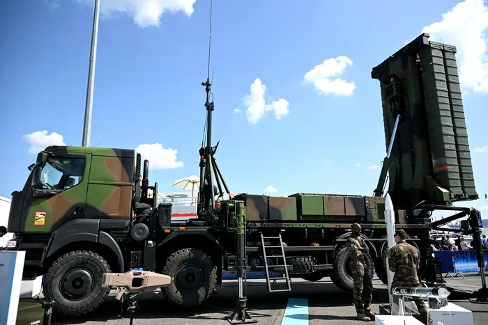 Sistemul strategic de apărare aeriană SAMP-T NG al consorțiului franco-italian Eurosam expus la Salonul Internațional al Aerului de la Paris de pe aeroportul Paris-Le Bourget, la nord de Paris, pe 17 iunie 2025.