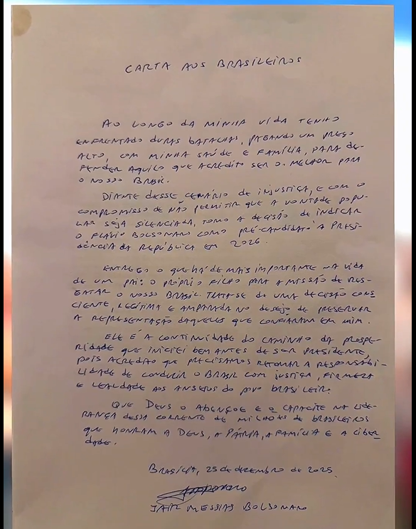 „Scrisoare către poporul brazilian. De-a lungul vieții mele, m-am confruntat cu bătălii grele, plătind un preț mare cu sănătatea și familia mea, pentru a apăra ceea ce cred că este mai bine pentru Brazilia noastră. Confruntat cu acest scenariu de nedreptate și cu angajamentul de a nu permite ca voința populară să fie redusă la tăcere, am decis să-l nominalizez pe Flávio Bolsonaro drept candidat la funcția de Președinte al Republicii în 2026. Îi încredințez ceea ce este cel mai important în viața unui tată, propriul său fiu, misiunii de a salva Brazilia noastră. Aceasta este o decizie conștientă și legitimă, susținută de dorința de a păstra reprezentarea celor care au avut încredere în mine. El este continuarea drumului spre prosperitate pe care l-am început cu mult înainte de a deveni președinte, pentru că cred că trebuie să ne reluăm responsabilitatea de a conduce Brazilia cu dreptate, fermitate și loialitate față de aspirațiile poporului brazilian”, a menționat Jair Bolsonaro în scrisoarea pe care fiul său, Flávio, le-a citit-o jurnaliștilor.