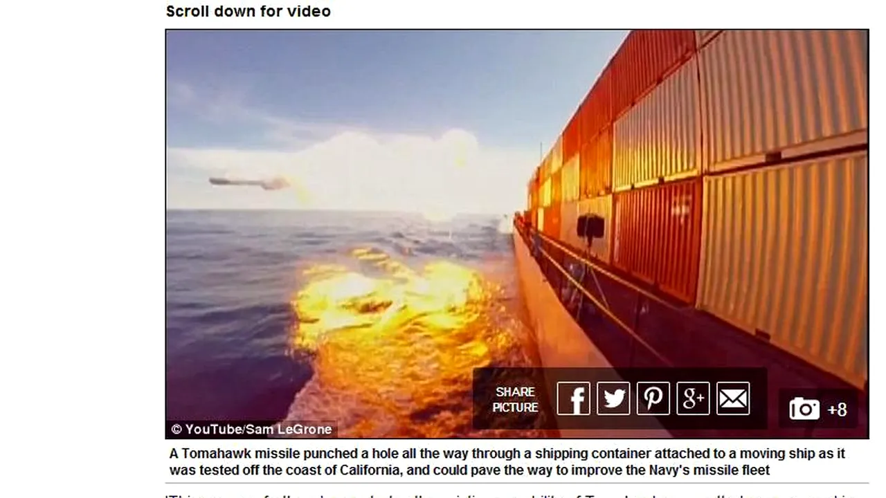 Racheta a trecut pur și simplu prin container și s-a lovit de apă, fiind lansată din vecinătatea San Nicolas Island, California, scrie Daily Mail. „Succesul acestui test demonstrează capacitatea rachetei de croazieră Tomahawk de a ataca țintele aflate în mișcare”, a declarat căpitanul Joe Mauser, managerul programului Sistemului de Armament Tomahawk (PMA-280) pentru NASC (Naval Air Systems Command).