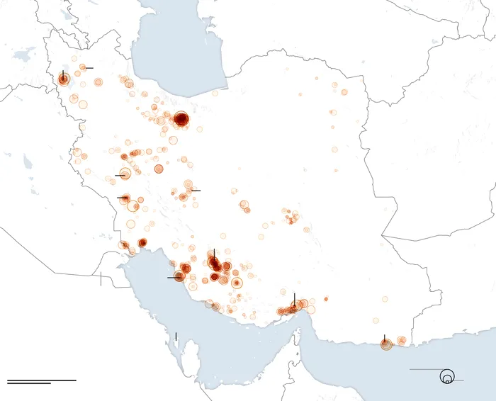 Potrivit imagini de mai sus, punctele albastre reprezintă locațiile unde forțele Statelor Unite și cele ale Israelului au atacat. punctele colorate în roșu reprezintă riposta Iranului asupra Israelului, a bazelor militare americane din Orientul Mijlciu și asupra aliaților Washingtonului din regiune. Cu cât intensitatea culorilor este mai mare, cu atât bombardamentele au fost mai concentrate.