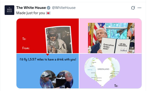Casa Albă marchează ziua de Valentine’s Day printr-o serie de felicitări digitale atipice, intitulate „Made just for you”, care îmbină temele romantice cu mesaje politice și geopolitice controversate. Felicitările postate pe platforma de socializare X continuă stilul de comunicare provocator al administrației Trump.
