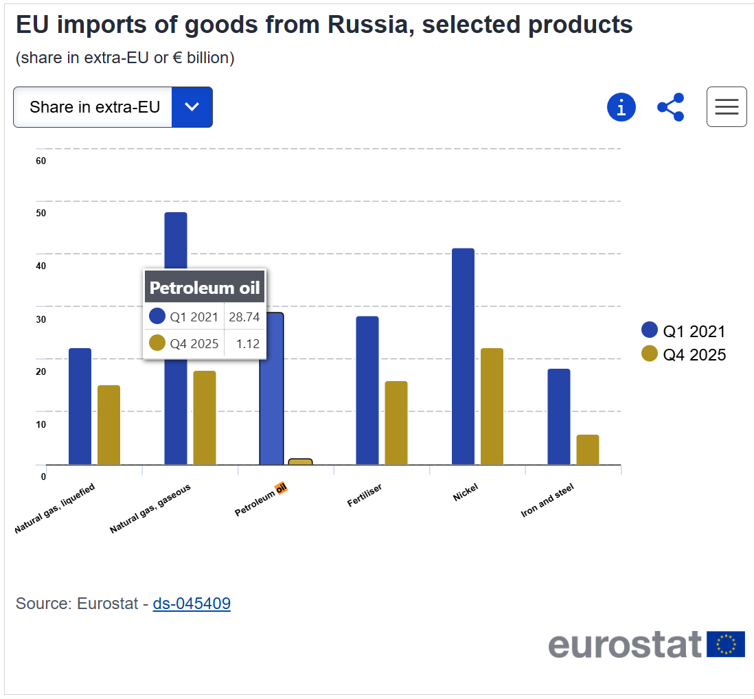 Eurostat a estimat că UE a continuat să importe și petrol rusesc, dar la nivel mai mic în comparație cu cel de acum 5 ani: de la o cantitate de petrol în valoare de 28,74 miliarde de euro în prima parte a anului 2021 la o cantitate de petrol care valorează 1,12 miliarde în ultima parte a anului 2025.