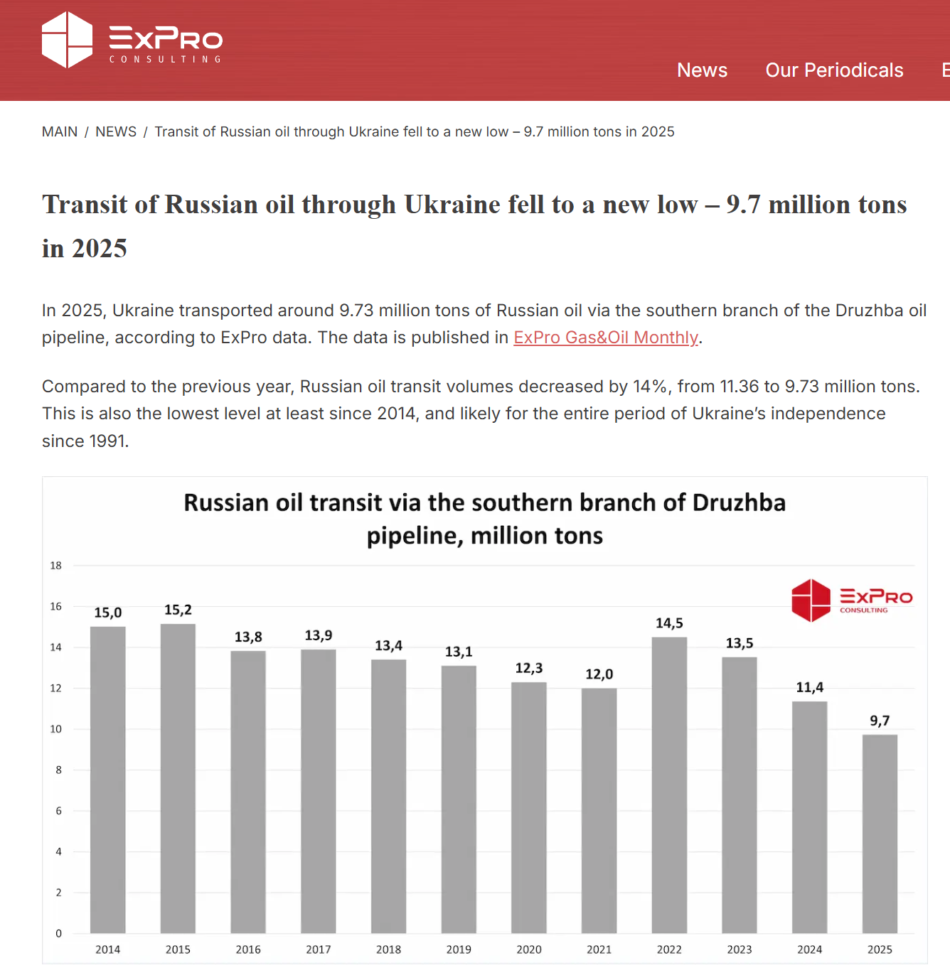 În 2025, Ucraina a obținut profit de 200-250 de milioane de dolari din taxele de tranzit pentru 9,7 milioane de petrol rusesc, prin ramura sudică a conductei Drujba, arată analizele ExPro. Destinațiile principale au fost Slovacia (4,9 milioane de tone) și Ungaria (4,35 milioane de euro). Ungaria și Slovacia erau aprovizionate până anul trecut și cu petrol rusesc prin conducta Drujba.