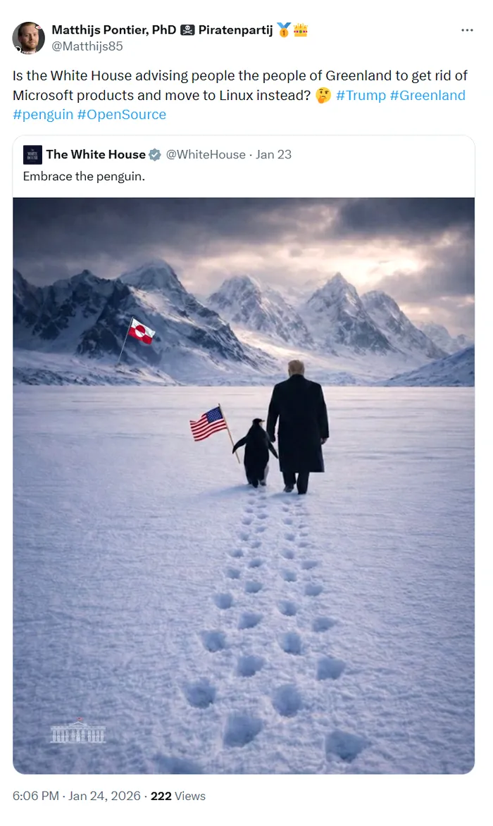Unii internauți au scris pe X că Trump ar fi făcut o reclamă ironică la Linux, îndemnându-i pe groenlandezi să renunțe la produsele companiei Microsoft (adică, sistemul de operare Windows).
