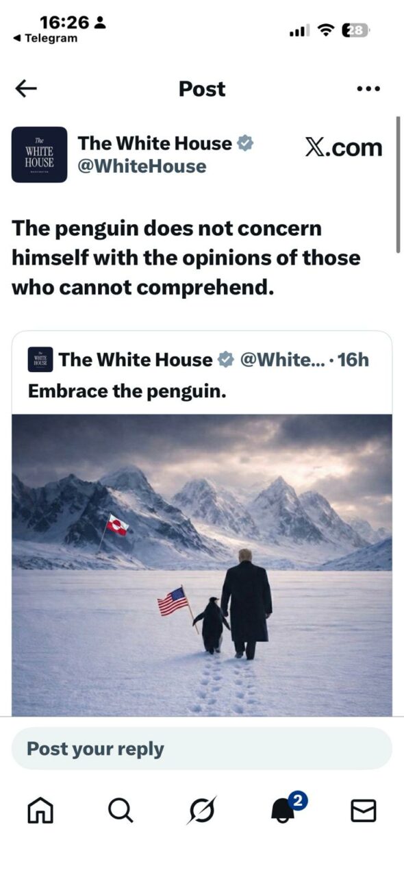 Pe paginile de socializare ale Casei Albe, președintele a postat o imagine generată de inteligența artificială, ilustrându-l pe acesta cum se deplasează prin zăpadă, alături de un pinguin chiar în Groenlanda. Imaginea din postarea de pe pagina Casei Albe este însoțită de mesajul „Îmbrățișează pinguinul”. Pinguinul ține în aripioara stângă drapelul SUA, iar pe fundal, în munții arctici, se poate vedea drapelul Groenlandei arborat.