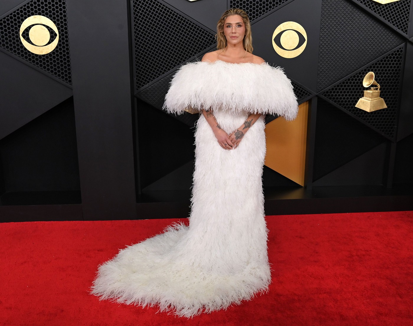Și pentru că Lady Gaga a fost „lebăda neagră“, de pe covorul roșu nu putea să lipsească și cealaltă versiune a sa. Kesha a pășit pe covorul roșu într-o rochie voluminoasă din pene albe de la Atelier Biser.