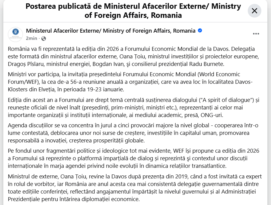 Pe fondul unor fragmentări politice și ideologice tot mai evidente, WEF își propune ca ediția din 2026 a Forumului să reprezinte o platformă imparțială de dialog și reprezintă şi contextul unor discuții internaționale în marja agendei privind noile evoluții în dinamica relațiilor transatlantice, anunță Ministerul Afacerilor Externe.