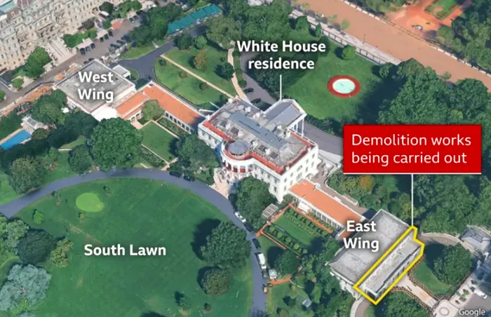 Deși Casa Albă a promis solemn că „nicio parte istorică nu va fi atinsă”, realitatea a început totuși cu buldozere. Fațada Aripii de Est este deja parțial demolată, pentru a face loc unui ballroom.