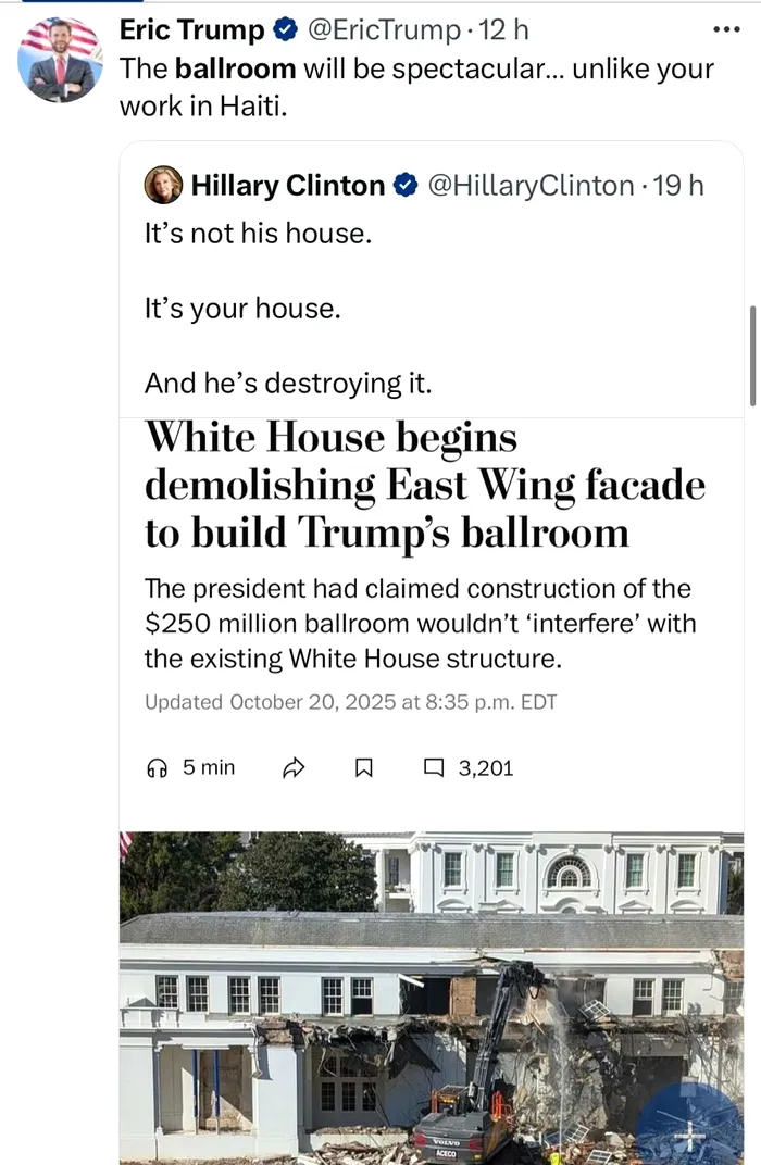 „Nu este casa lui. Este casa voastră. Și el o distruge”, a scris fosta senatoare pe X, incluzând o captură de ecran dintr-un articol al Washington Post despre renovare. Eric Trump i-a răspuns : „Sala de bal va fi spectaculoasă…nu ca munca ta în Haiti”.