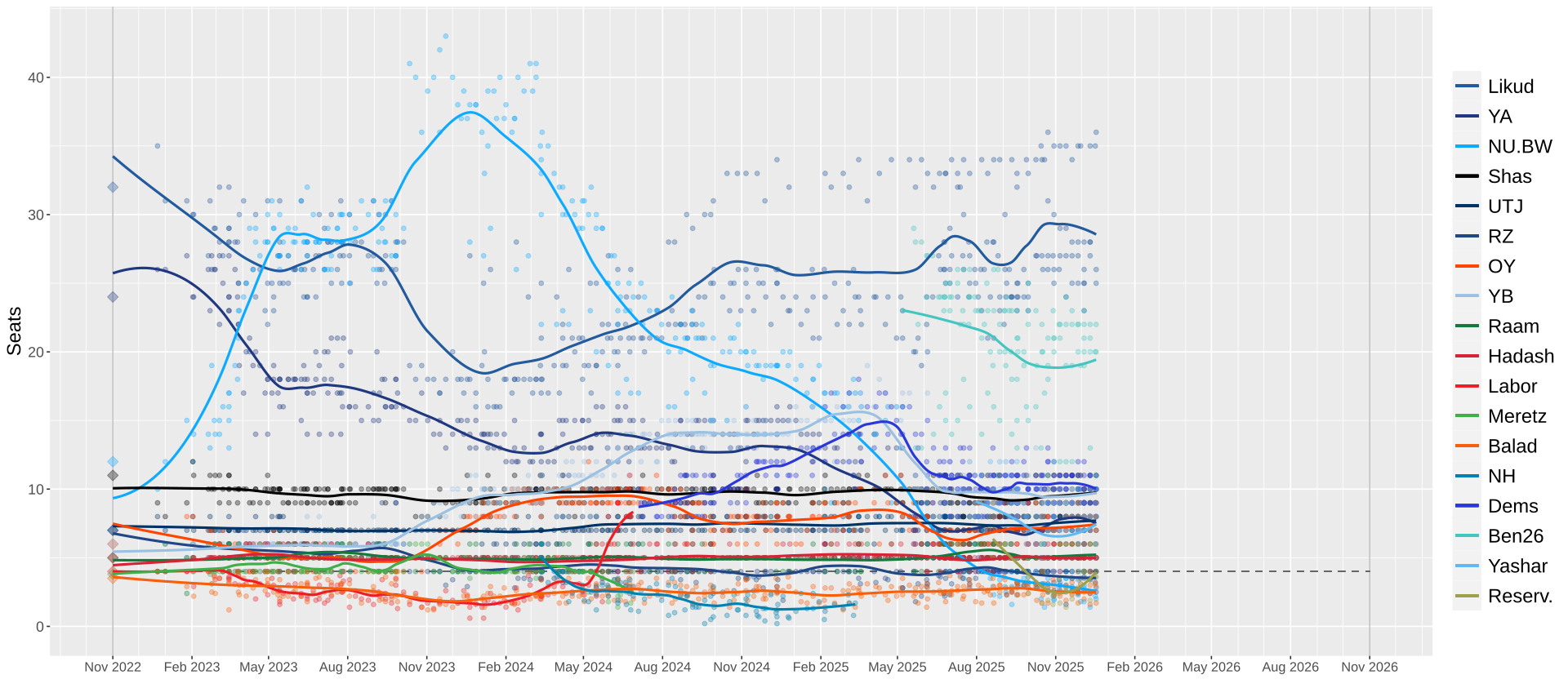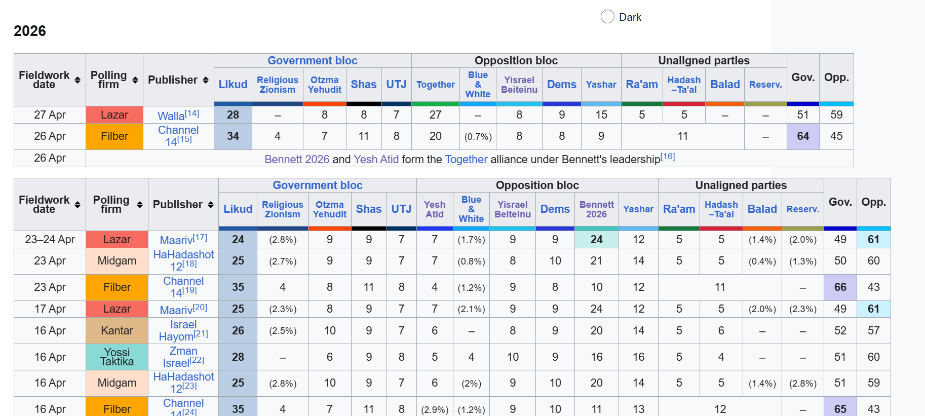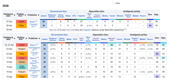 Netanyahu se află la cel de-al treilea mandat de prim-ministru: 1996-1999, 2009 – 2021, 2022- prezent. Potrivit sondajelor, Likud încă este pe prima poziție, dar cu o popularitate de 28%. Sondajul de opinie Walla raportează că formațiunea politică creată de Bennett și Lapid are 27%.