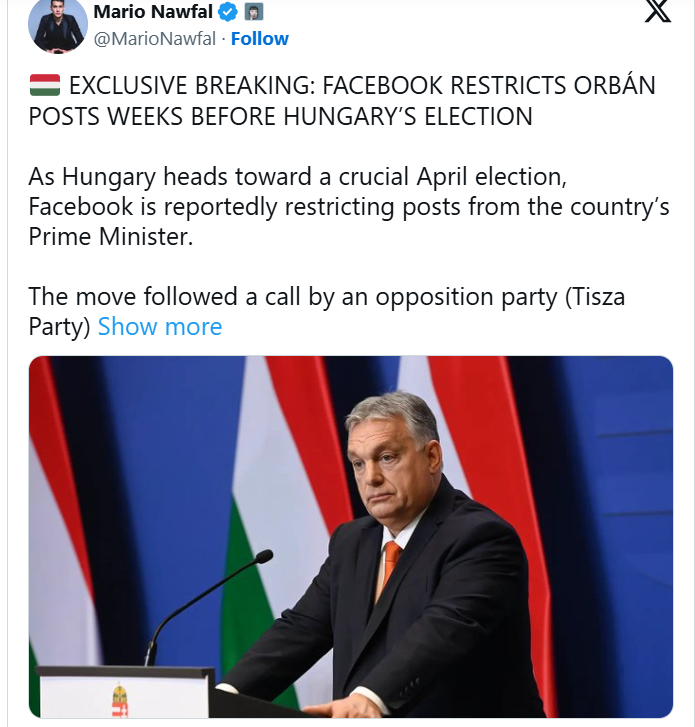 „EXCLUSIVE BREAKING: FACEBOOK I-A RESTRICȚIONAT POSTĂRILE LUI ORBÁN CU SĂPTĂMÂNI ÎNAINTE DE ALEGERILE DIN UNGARIA”, a declarat Nawfal pe 18 martie.