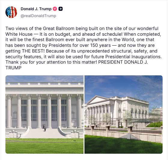 „Două imagini ale Marii Săli de Bal construite pe amplasamentul minunatei noastre Case Albe – Este în limita bugetului și înainte de termen! Când va fi finalizată, va fi cea mai frumoasă Sală de Bal construită vreodată în lume, una pe care președinții au căutat-o timp de peste 150 de ani — iar acum o primesc pe CEA MAI BUNĂ! Datorită caracteristicilor sale structurale, de siguranță și de securitate fără precedent, va fi folosită și pentru viitoarele inaugurări prezidențiale. Vă mulțumim pentru atenția acordată acestei chestiuni!”, a scris Donald Trump pe Truth Social.