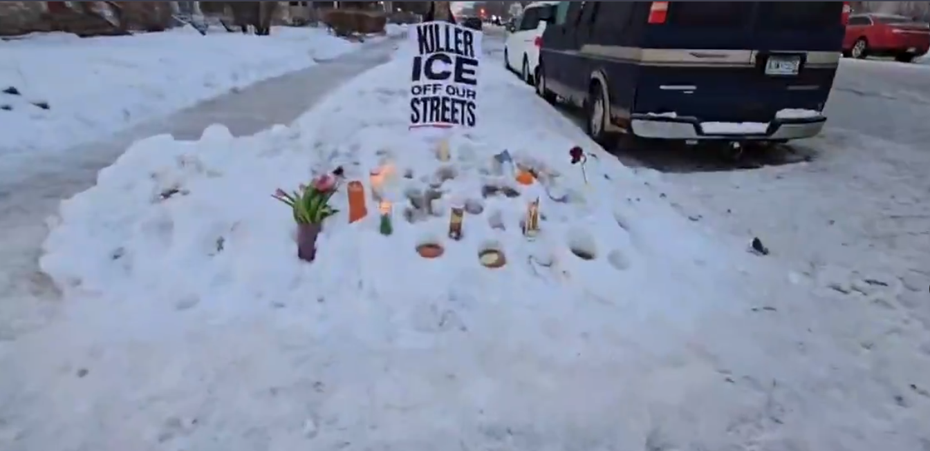 Oamenii au depus lumânări și flori. În prezent a rămas un carton alb pe care scrie: „Afară cu ucigașul ICE de pe străzile noastre”.