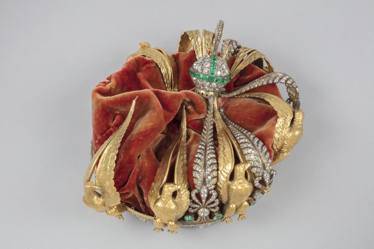 „Coroana prezintă inițial opt palmetele din diamante și smaralde, alternate cu opt vulturi din aur. Astăzi, doar unul dintre aceștia lipsește”, precizează muzeul.