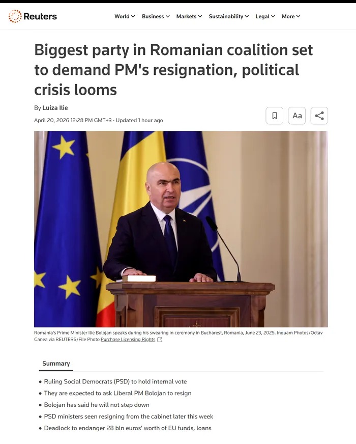 Reuters scrie că este de așteptat ca Partidul Social Democrat să-și retragă sprijinul pentru premierul din partea Partidului Național Liberal, Ilie Bolojan.