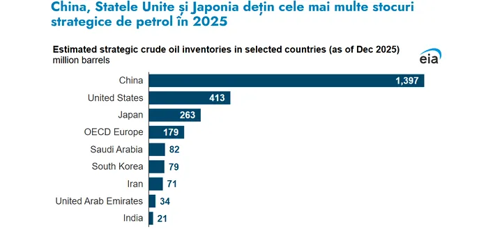 În anul 2025, China a depozitat mai mult petrol decât orice altă țară, conform ultimelor date publicate de guvernul american în această săptămână. La sfârșitul anului 2025, statul chinez deținea cea mai mare rezervă strategică de petrol din lume, estimată la aproape 1,4 miliarde de barili. Această cantitate depășește cu mult ocupantul locului doi în top, Statele Unite, care aveau o rezervă strategică de 414 milioane de barili în aceeași perioadă.